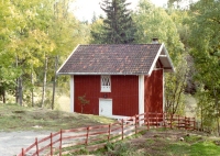 Gammelt stabbur fra 1851 i to etasjer, som vi flyttet til gården fra Åssiden i Drammen 1989/90. Stabburet